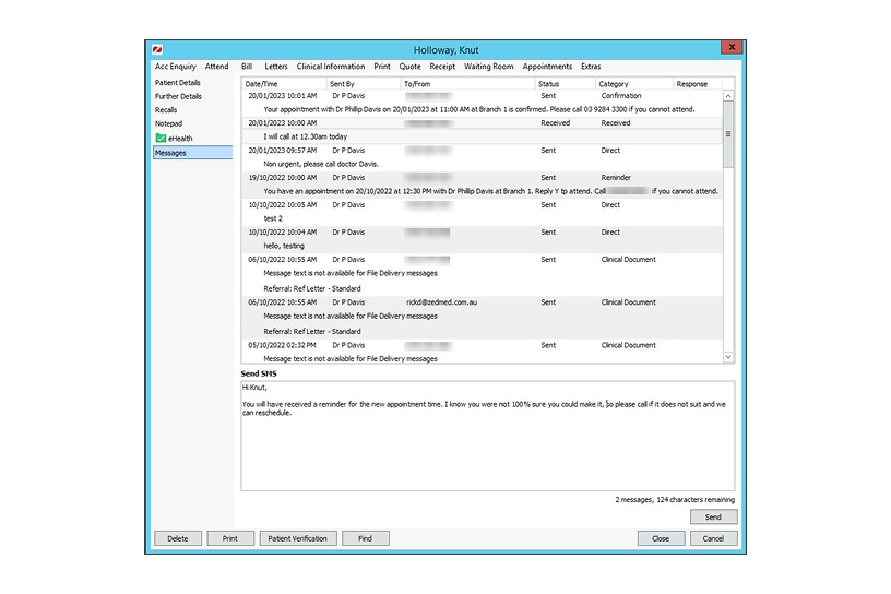 Enjoy real time, 2-way patient communications with Zedmed. Each patient has a messaging section where you can see all previous messages and send new ones all in the one place.
